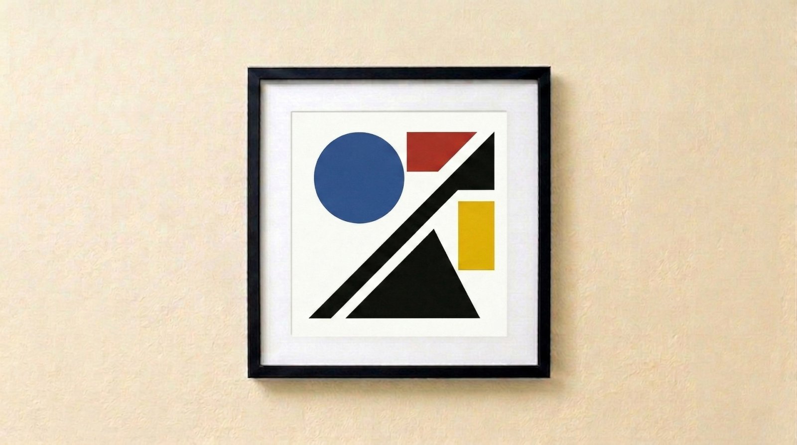 Die Farben knüpfen an die Tradition des Bauhauses an, fungieren hier aber als Schichtung von Kräften. Der blaue Kreis wirkt als ruhender Pol, während das rote Trapez und das gelbe Rechteck die dynamische Struktur der Diagonalen ausbalancieren.