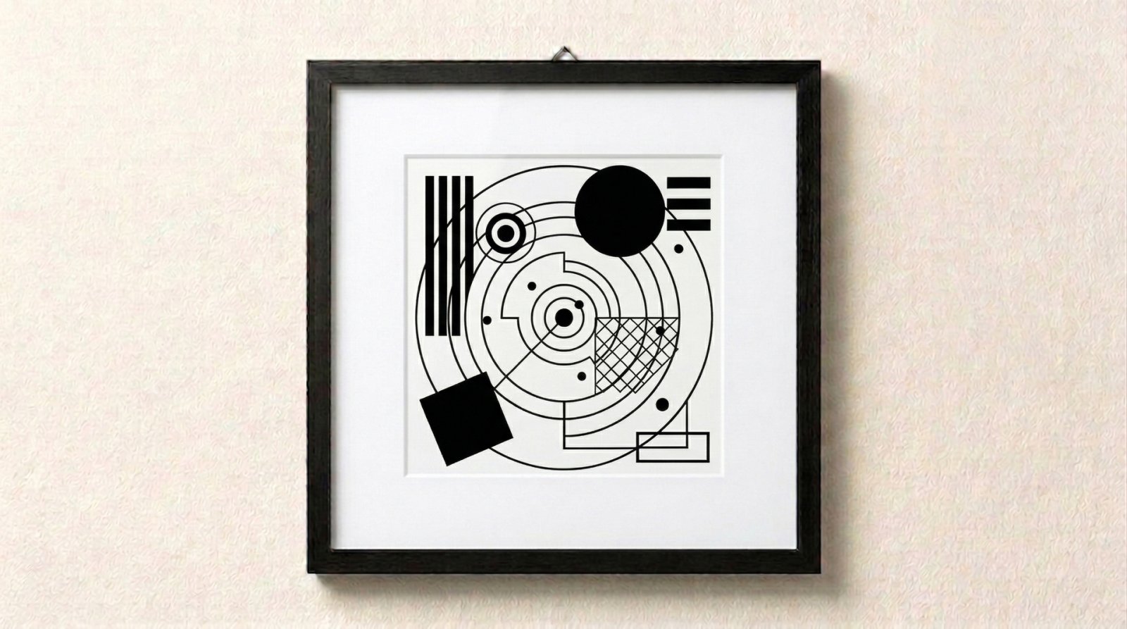 Die Komposition weist eine hohe strukturelle Dichte auf. Ein großer schwarzer Kreis agiert als dominantes Gewichtsfeld, während ein geneigtes schwarzes Quadrat als dynamischer Störkörper die orthogonale Logik bewusst bricht. Es entsteht kein ruhendes Gleichgewicht, sondern ein aktiv gehaltenes System, das die Anmutung eines technischen Plans oder eines orbitalen Steuerungsfeldes besitzt.